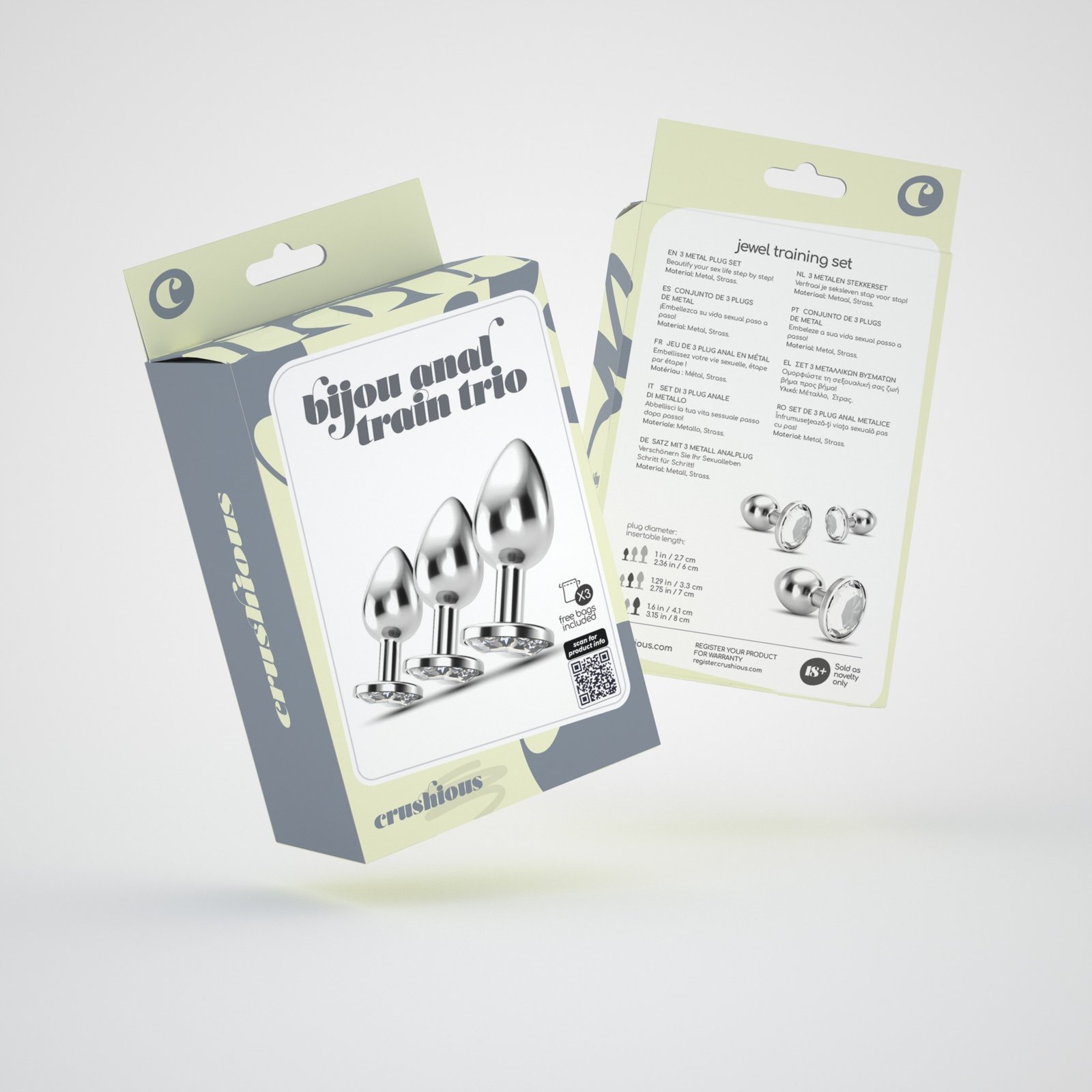 “Entregue-se da forma mais luxuosa! Crushious apresenta a coleção de joias anais mais cobiçadas e elegantes. Bijou traz até si plugs anais sofisticados, apresentados num conjunto de 3 tamanhos diferentes para ir aumentando a sua resistência gradualmente.Bijou pode ser usado como um adorno numa sessão de strip tease e como estimulação extra durante a penetração vaginal.O metal é perfeito para jogos de temperatura, submerja o seu plug em água quente ou fria para novas e excitantes experiências!Use com lubrificante para melhor inserção. Escolha os lubrificantes Crushious na versão Waterbased ou Anal para ainda melhores resultados.Lave com água morna e sabão neutro após o uso, pode também utilizar um detergente antibacteriano específico para brinquedos.Perfeito para treinar a resistência anal.Dimensões:S – Comprimento Inserível: 6cm; Diâmetro: 2,7cm.M – Comprimento Inserível: 7cm;Diâmetro: 3,3cm.L – Comprimento Inserível: 8cm;Diâmetro: 4,1cm.”