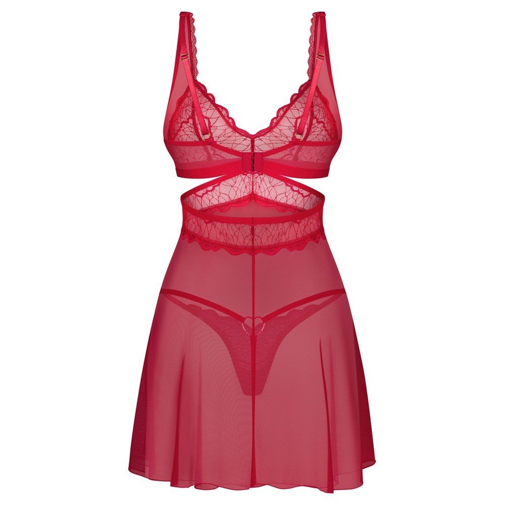 “Material vermelho sensual para fantasias escaldantes! O conjunto Cupide Desir da Obsessive contém um babydoll e uma tanga em material vermelho sensual com detalhes dourados. O conjunto tem um aspeto sedutor e transparente de renda delicada. O conjunto é macio e elástico para um ajuste muito confortável. Com um discreto pormenor decorativo entre as copas sem fios. As alças podem ser ajustadas à medida. Há um fecho de gancho na parte de trás para ajustar o babydoll. A bonita tanga de renda tem um coração decorativo sobre as nádegas.94% poliamida, 6% spandex; tanga 90% poliamida, 10% spandex. “