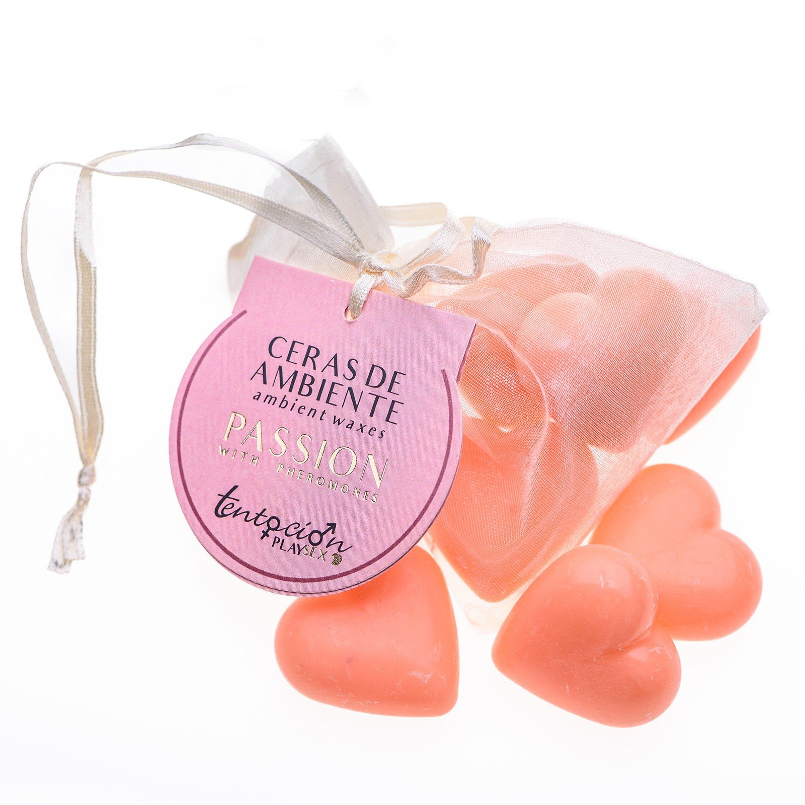 “Passion – aroma composto por Patchouli, Cacau e Baunilha de MadagáscarCeras vegetais com feromonas, para uso em queimador próprio para uso com o Queimador de Lâmpada Eléctrica, Corazon – PlaysexModo de utilização: Colocar num queimador seguro para cera e deixar a fragrância evaporar.”